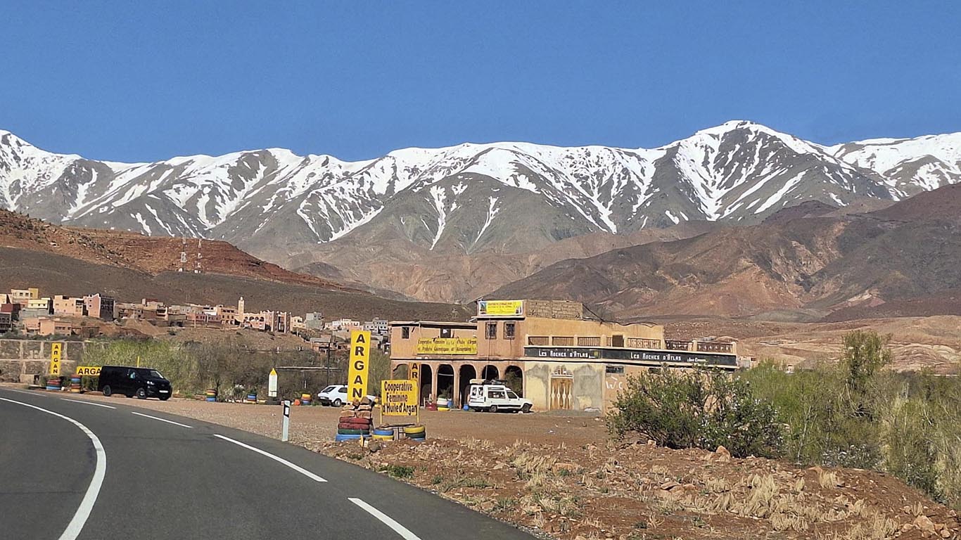 De reis gaat verder naar het indrukwekkende Atlasgebergte, waar je verblijft in een authentieke kasbah in het bergdorp Imlil. Hier kun je ontspannen wandelen door de natuur, genieten van panoramische uitzichten en het lokale leven ontdekken tijdens een traditionele thee-ceremonie bij een Berberfamilie.