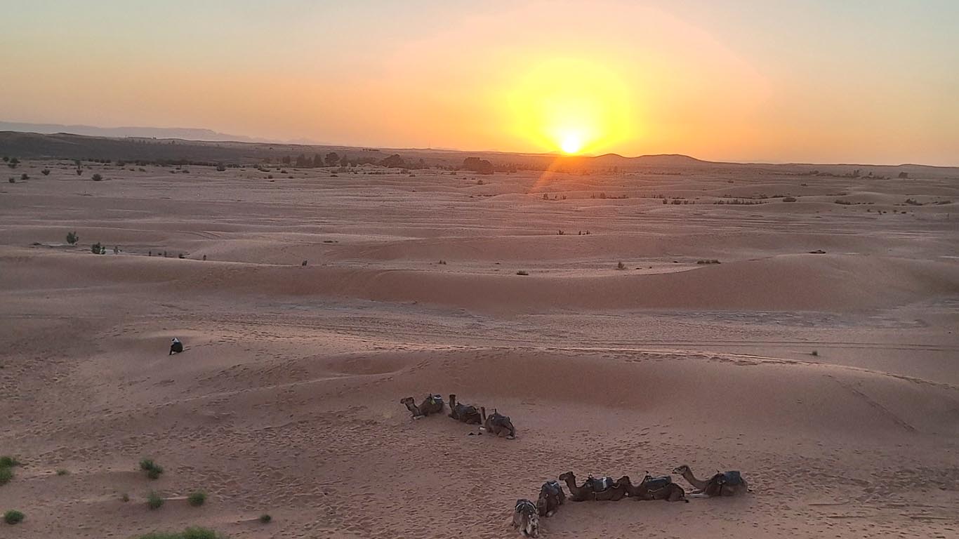 Daarna verruil je de stad voor de uitgestrektheid van de Agafay-woestijn. Hier verblijf je in een luxe woestijnkamp, waar je kunt genieten van het open landschap, de bijzondere rotsformaties en de spectaculaire zonsondergangen. ’s Avonds dineer je onder een eindeloze sterrenhemel bij het kampvuur, met traditionele muziek en een warme sfeer – een ervaring die een gevoel van ruimte en rust geeft, ver weg van de drukte van de stad.